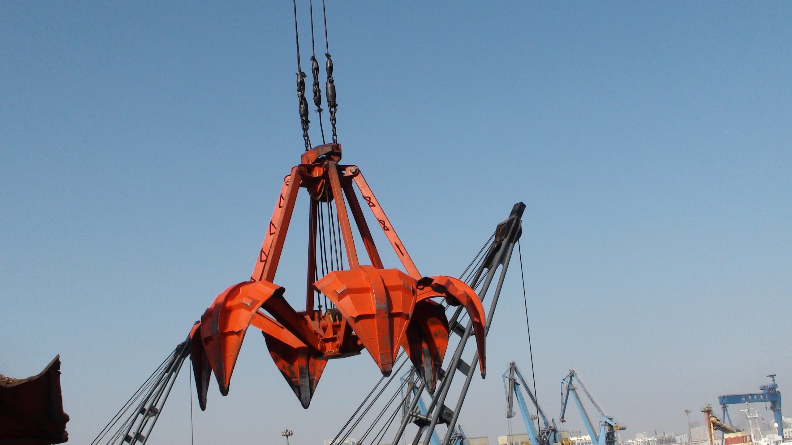 四索多瓣抓斗是一种高效的工具,它可以在任何恶劣的情况下代替人力装卸生铁、矿石、熟料、垃圾、木屑等块状货物。 也可用于疏浚中装载石料。 桔皮抓斗的特点是结构简单,开合装置新颖,操作方便。 目前,这种抓斗广泛应用于港口、航运、矿山、冶金、建筑、垃圾处理厂,并批量出口。 为了装载废钢和垃圾,果皮通常设计为半封闭式。